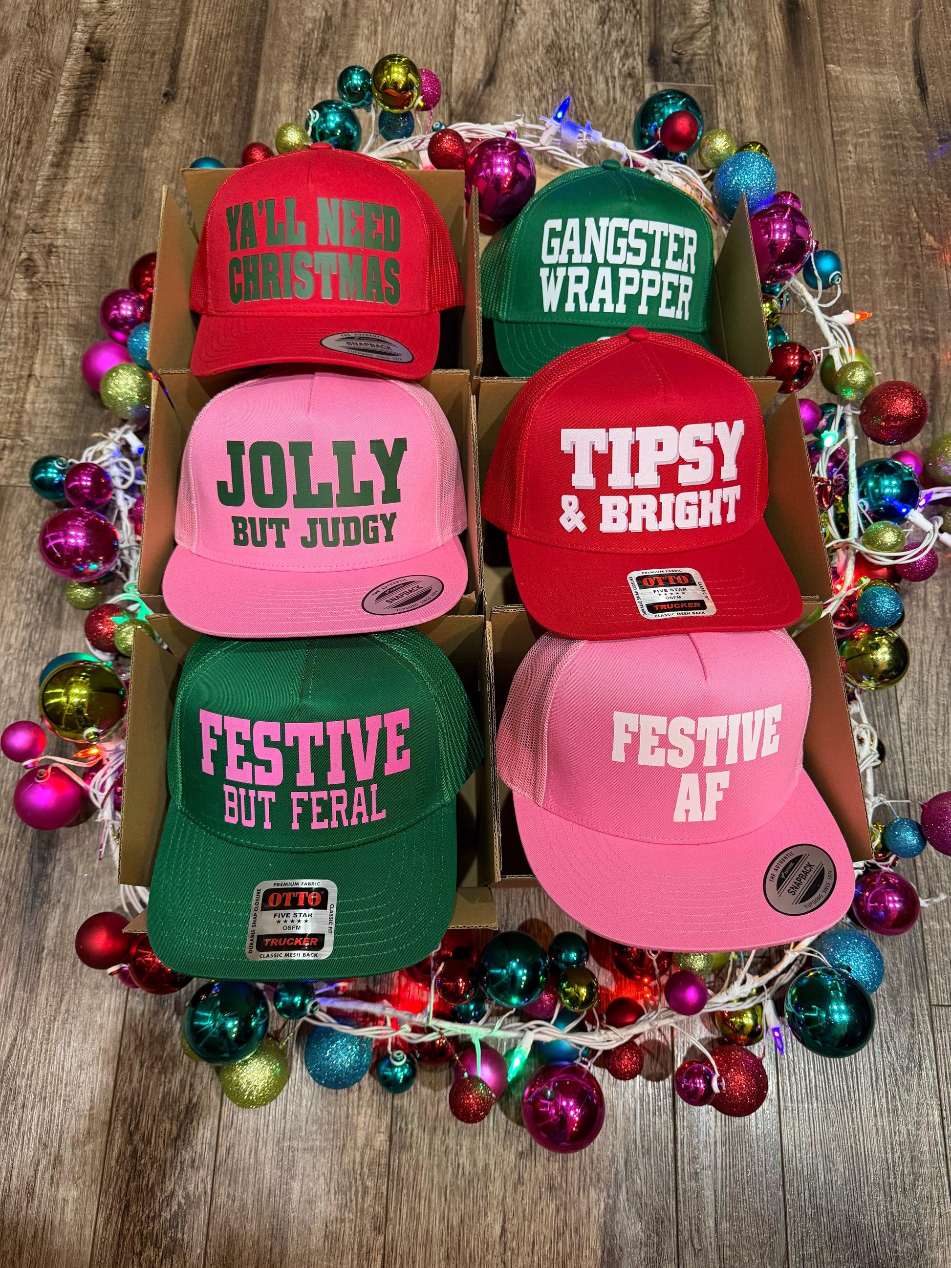 These custom Dues & Co Christmas trucker hats are the perfect way to show off your personality at parties, family gatherings, work events, or while Christmas shopping. Each hat features bold holiday sayings on a bright, high quality snapback trucker hat.